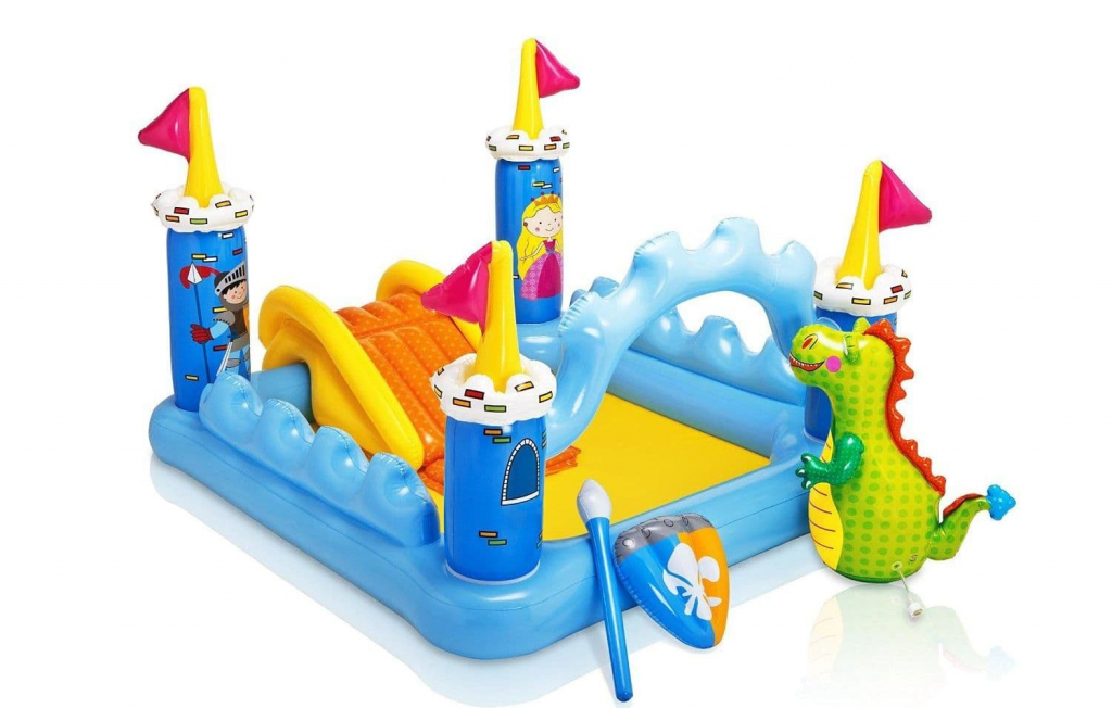 Надувной игровой центр Фэнтези выполнен в форме средневековой крепости. Его площадь позволит играть одновременно нескольким ребятишкам. В этой крепости можно играть, плескаться, спускаться с горки, брызгаться надувным драконом и поиграть в плавающих рыцарей.